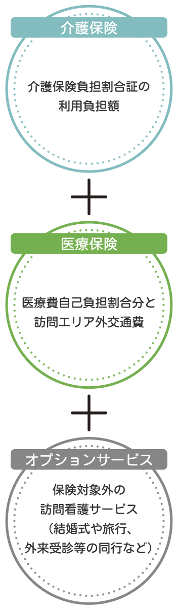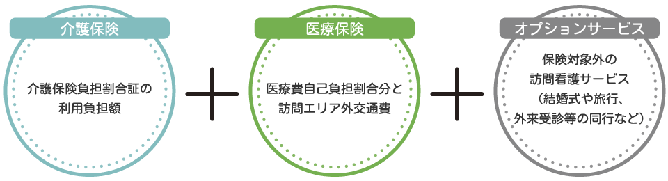 訪問看護ご利用料金は、医療保険・介護保険の自己負担割合に応じた自己負担金(または全額自費)と訪問エリア外交通費、 保険対象外の訪問看護サービス代金の加算となります。